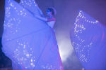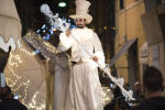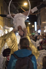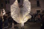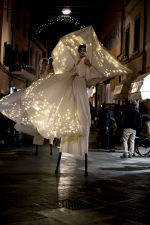 Bianche Farfalle, eteree, eleganti, accompagnate da angeli bianchi in frac trasformano la città in un luogo magico, lontano dal tempo. Figure che danzano, volano, stupiscono e attraverso giochi pirotecnici rendono i luoghi in posti surreali. I trampolieri sono accompagnati da un elegante carro che diffonde nell’aria luci e leggere musiche sulle quali gli attori danzano. Sopra il carro una ballerina volteggia in aria sul suo cerchio aereo itinerante.